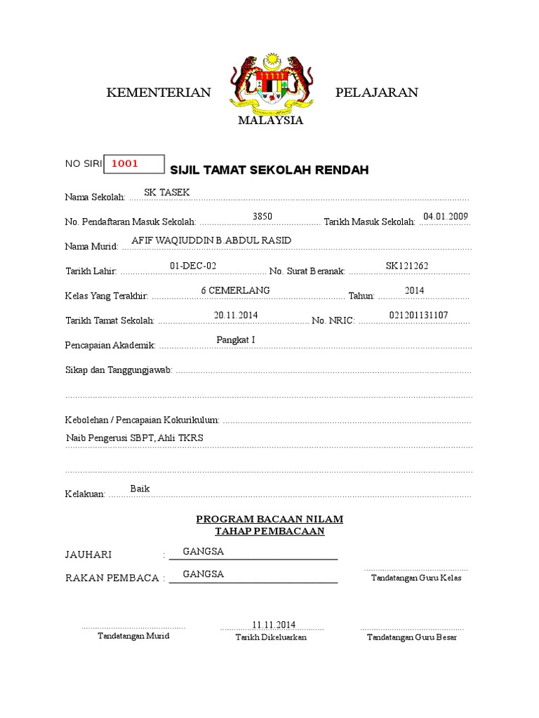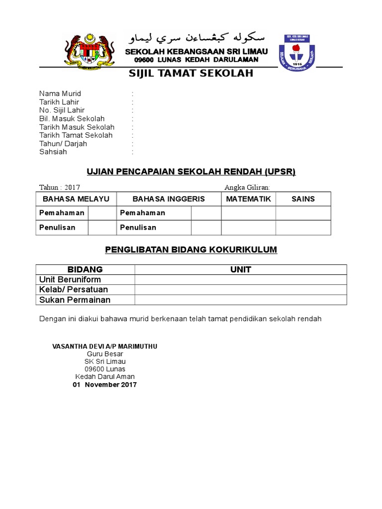 Sijil Tamat Persekolahan Sekolah Rendah Pdf